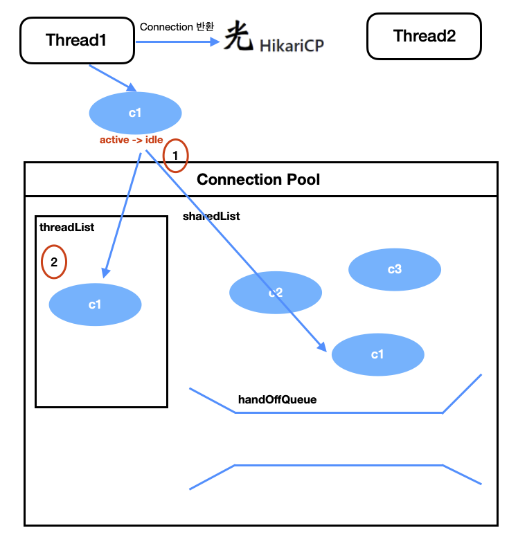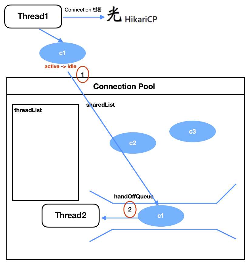 가정: Thread1이 Connection을 반환 하려고 한다. 또한, 현재 Thread2가 handOffQueue앞에 대기하고 있다.