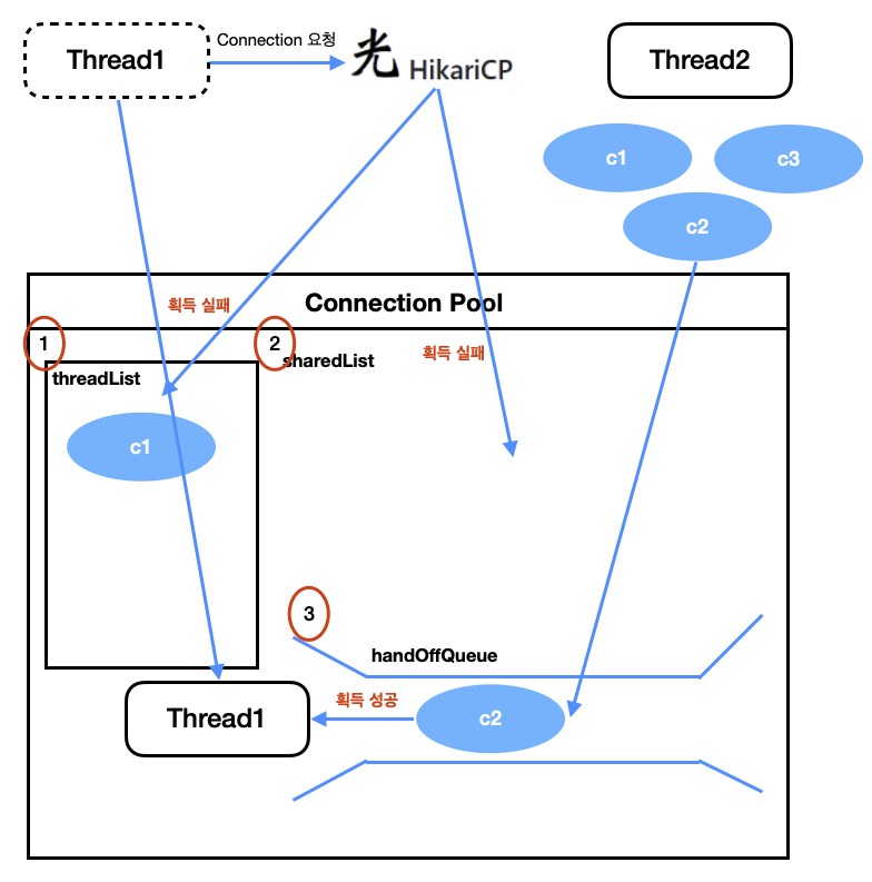 - 1번 과정: 위와 같이 Thread가 Connection을 요청한다면 HikariCP는 먼저 ThreadList를 검사해서 해당 Thread가 사용했던 Connection 이력이 있다면, 해당 Connection을 먼저 전달해준다. (Connection 상태가 idle인 경우만 해당된다.)