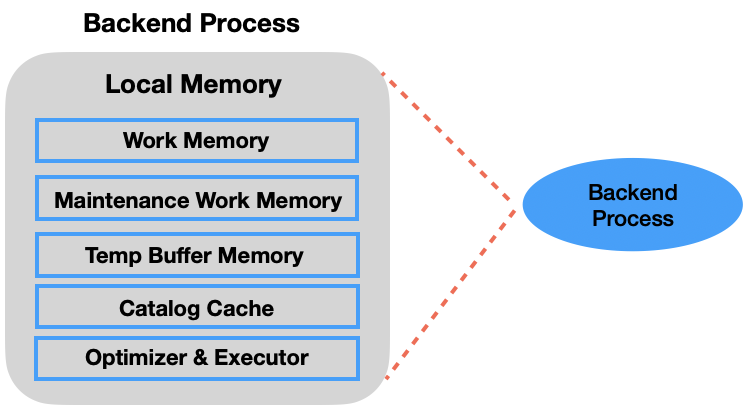 - Backend 프로세스는 Client가 요청하는 쿼리를 수행하며, 작업 수행을 위한 로컬 메모리 영역이 존재한다.